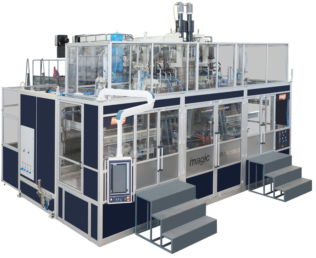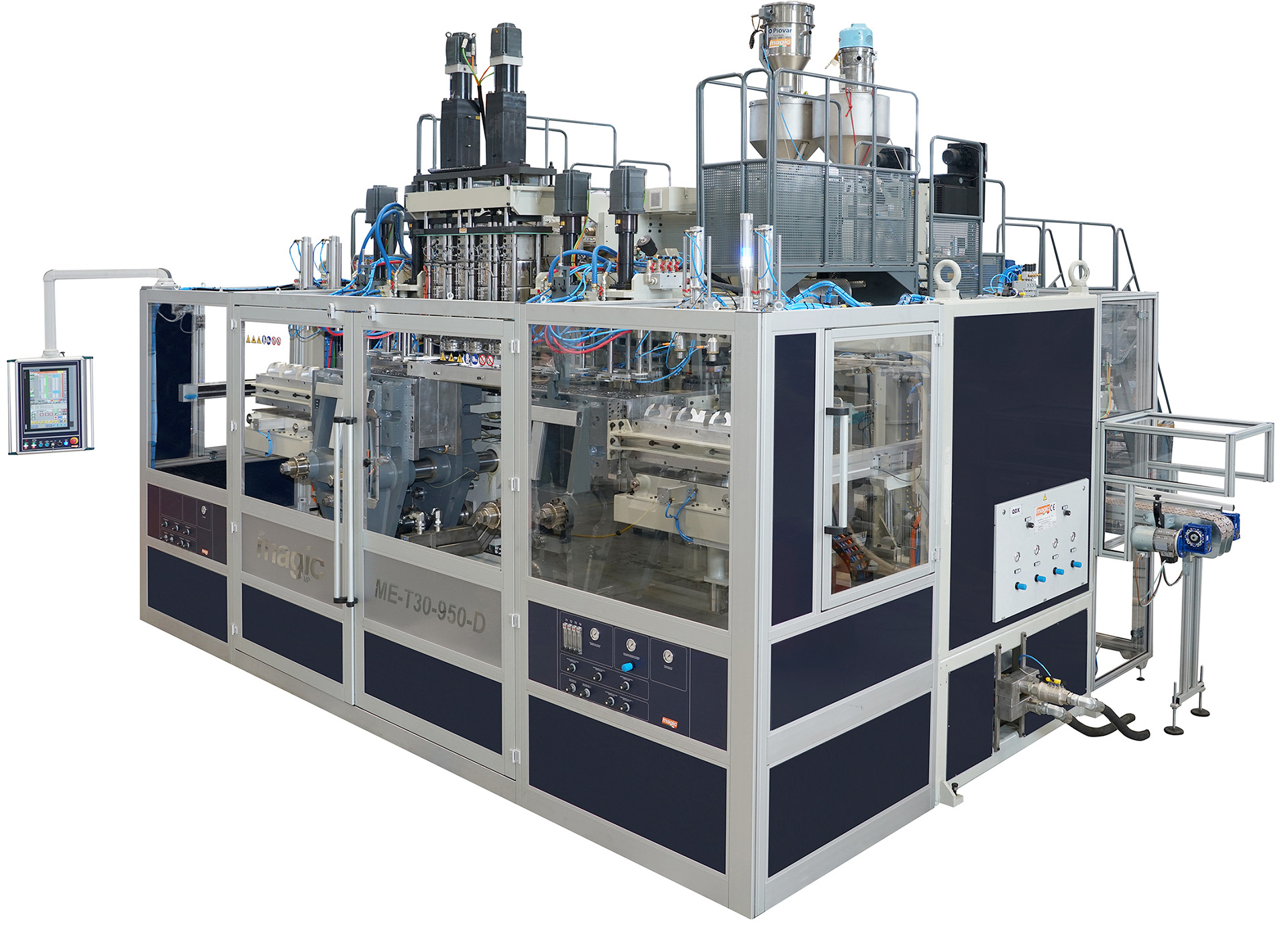 Magic can boast the widest range of machines offered, especially full electric, from the smallest and fastest machine in the world that produces small containers from 100 cc to the largest machine that produces jerricans of 30, 50, 220 and 1000 liters with the maximum clamping force of 100 kN.